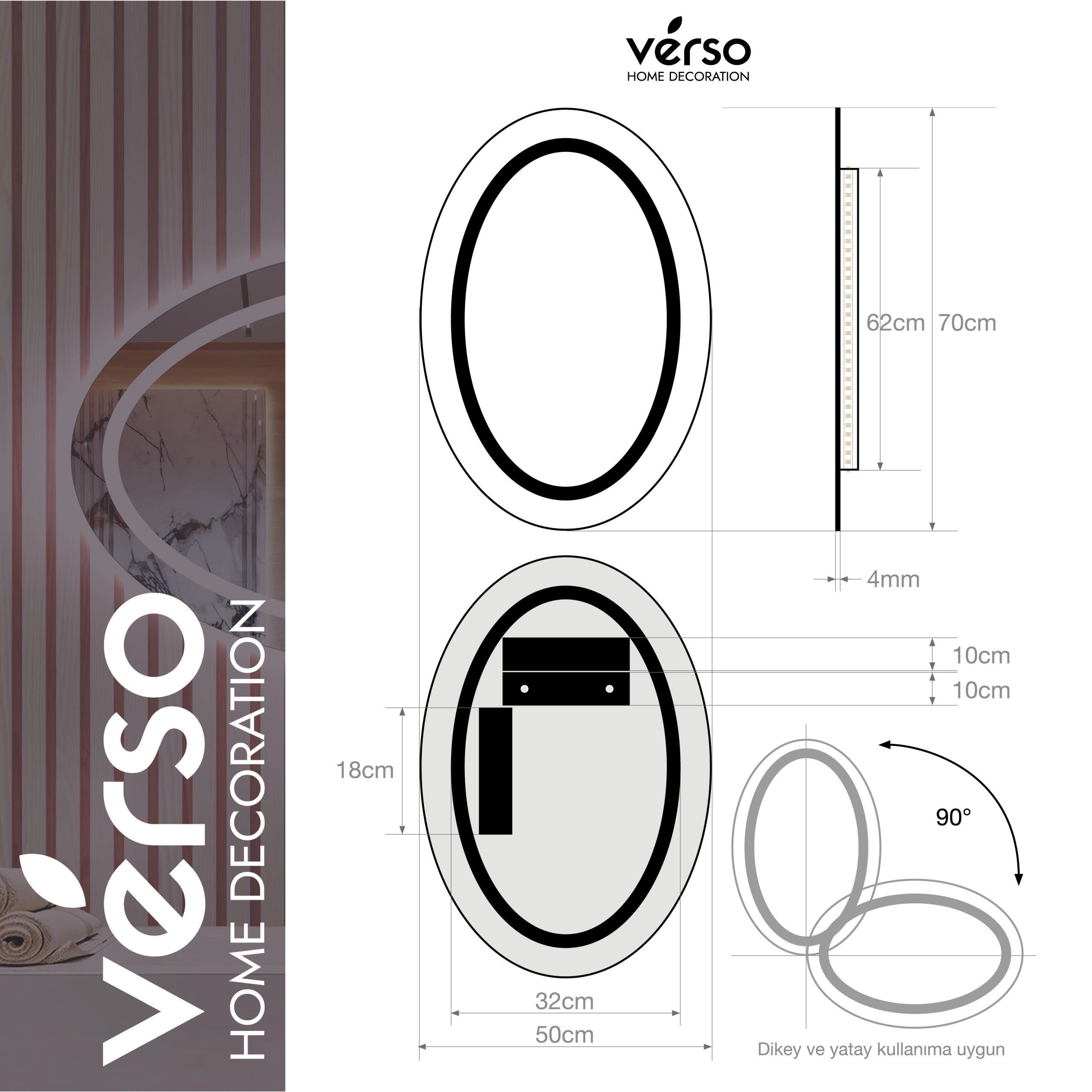 Bu şık ve modern **Verso Home 70x50cm LED’li Oval Beyaz Dekoratif Ayna**, yaşam alanınıza zarif bir dokunuş katmak için tasarlanmıştır. Oval şekli ile hem fonksiyonel hem de estetik açıdan mükemmel bir seçimdir. Aynanın etrafındaki entegre yüksek kaliteli **LED aydınlatma**, beyaz tonlarda sıcak bir ışık yayarak mekânınıza doğal ve ferahlatıcı bir atmosfer kazandırır.
